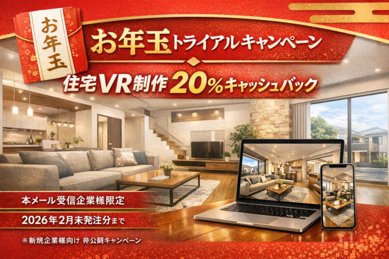 このページは、デジタルビルドからご案内メールをお送りした企業様限定の非公開キャンペーンページです。※公式サイトやSNSでは公開しておりません。 キ ャ ン ペ ー ン 実 施 背 景 デジタルビルドでは、より多くの住宅メーカー・工務店様に住宅VRを一度体験していただきたいと考えています。住宅VRは、「導入前は効果をイメージしづらい」「しかし実際に使うと、営業現場での反応が大きく変わる」という特徴があります。そのため今回、「まずは一度使ってみる」ことを目的としたトライアルキャンペーンとして、特別条件でのご案内を行っています。 キ ャ ン ペ ー ン 内 容 デジタルビルドの下記サービスをご発注いただくと、合計発注金額の20%をキャッシュバックいたします。※個数や組み合わせは自由です。※合計発注金額を基準に還元額を算出します。 住宅VR制作(13視点)| ¥60,000〜/棟外観・内観(住設含む)の中から13視点を360°画像で体験できる完成イメージVRです。おすすめ用途・建売住宅、分譲住宅、リノベ物件の販売・完成前物件の商談・モデルハウス代替 住宅VR制作(5視点)| ¥40,000〜/棟外観・内観(住設含む)の中から5視点を360°画像で体験できる完成イメージVRです。おすすめ用途・建売住宅、分譲住宅、リノベ物件の販売・完成前物件の商談・モデルハウス代替 建築CGパース制作(外観&内観)| ¥15,000〜/枚外観・内観(住設含む)の中から5視点を360°画像で体験できる完成イメージVRです。おすすめ用途・建売住宅、分譲住宅、リノベ物件の販売・完成前物件の商談・モデルハウス代替 バーチャルステージング(内観)| ¥15,000〜/枚外観・内観(住設含む)の中から5視点を360°画像で体験できる完成イメージVRです。おすすめ用途・建売住宅、分譲住宅、リノベ物件の販売・完成前物件の商談・モデルハウス代替 ここをクリック キャッシュバックの受け取り方法 キャッシュバックは、担当者様の判断で受け取り方法を選択可能です。Amazonギフト券銀行振込(個人名義・法人名義いずれも可)会社への還元(実質割引扱い)※社内規定に合わせて柔軟に対応可能です。 対象期間 2026年2月末日までの発注分が対象※発注書のご提出をもって、キャンペーン適用が確定します。 発注からキャッシュバックまでの流れ コンタクトフォームからお申し込み単価表・発注書をお送りします発注書をご提出VR制作開始・納品ご請求 → 先払いにてお支払い翌月末までにキャッシュバック実施 お申し込み方法 本キャンペーンへの参加は、コンタクトフォームからのお申し込みのみとなります。内容が未確定でも問題ありません。まずはお気軽にお申し込みください。 お年玉トライアルキャンペーンに申し込む 注意事項 本メール受信企業様限定のキャンペーンです既存取引先様は対象外となります他キャンペーン・割引との併用はできません本ページURLの転送・共有はご遠慮ください本ページは検索エンジンに表示されない設定(noindex)となっています。 このフォームを送信することにより、プライバシーポリシーに同意したものとみなされます。By submitting this form, you agree to our Privacy Policy. 問い合わせ / Contact (お年玉トライアルキャンペーン)このフォームに入力するには、ブラウザーで JavaScript を有効にしてください。このフォームに入力するには、ブラウザーで JavaScript を有効にしてください。会社名 / Company Name *部署・役職 / Position *名前 / Name *名姓 / Mail about メールアドレス / Mail Address *ex)xxx@digitalbuild.jp携帯番号 / Mobile Number *ex)080-1234-5678ウェブサイト / Websiteex) https://www.digitalbuild.jpお問い合わせ項目 / about *お年玉トライアルキャンペーン申し込みオンライン相談希望その他内容 / Detail *・打ち合わせ候補日があれば第3希望日までご教授ください。送信 問い合わせ先 デジタルビルド株式会社代表取締役 佐藤 昂併TEL:03-6820-2272MAIL:k.sato@digitalbuild.jp